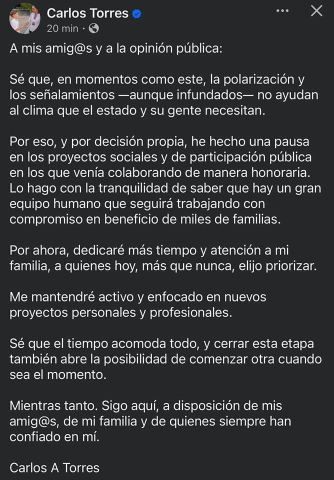 Sin previo aviso y en pleno torbellino mediático, Carlos Torres Torres anunció que “se separa temporalmente” de la Dirección de Proyectos Especiales del gobierno estatal. El comunicado, difundido la noche del martes, no detalla motivos ni plazos para su regreso, pero llega justo cuando arrecian las dudas sobre posibles investigaciones federales que lo señalarían por uso irregular de recursos y, de paso, coincide con el escándalo por la residencia en San Diego atribuida al círculo cercano de la gobernadora.