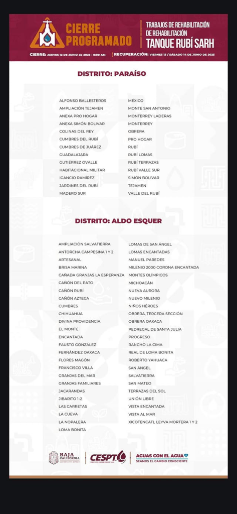A partir de la medianoche del jueves 12 de junio, la Comisión Estatal de Servicios Públicos de Tijuana (CESPT) interrumpirá el suministro de agua en 75 colonias de los distritos Aldo Esquivel y Paraíso.