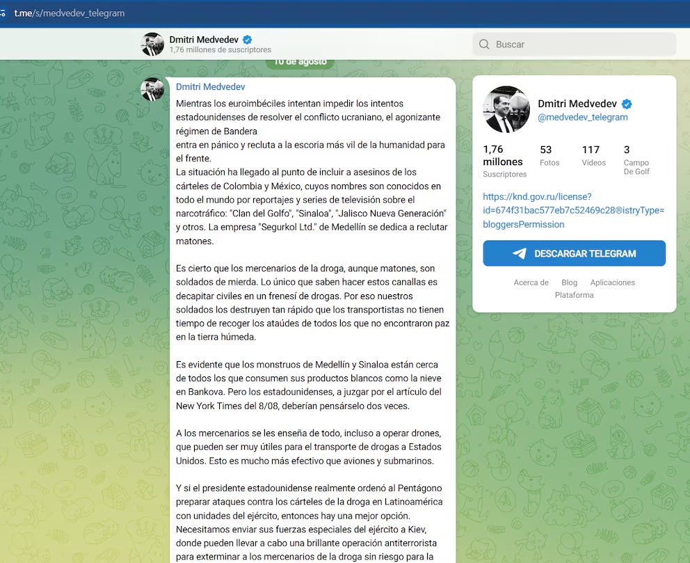 La denuncia fue difundida a través de su canal de Telegram, donde Medvédev afirmó que estos grupos criminales estarían siendo contratados a través de la empresa colombiana Segurcol Ltd., y que recibirían entrenamiento militar, incluyendo el uso de drones y tácticas de combate.